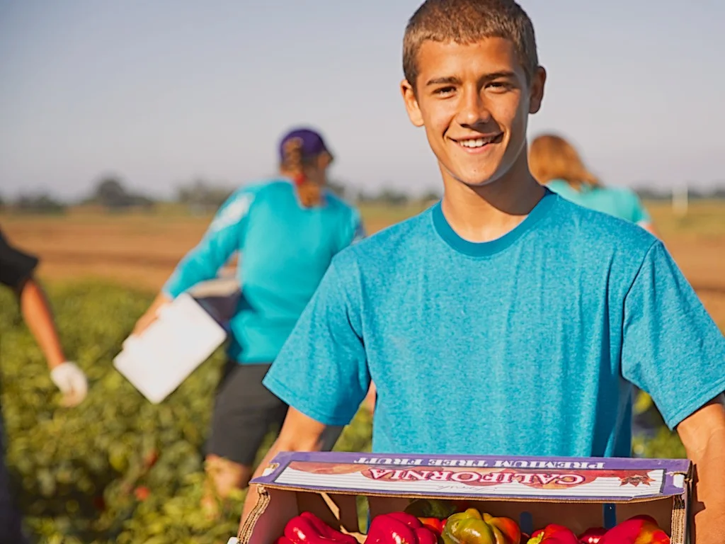 The young man in this photo had just filled his first produce box full of beautiful red peppers.